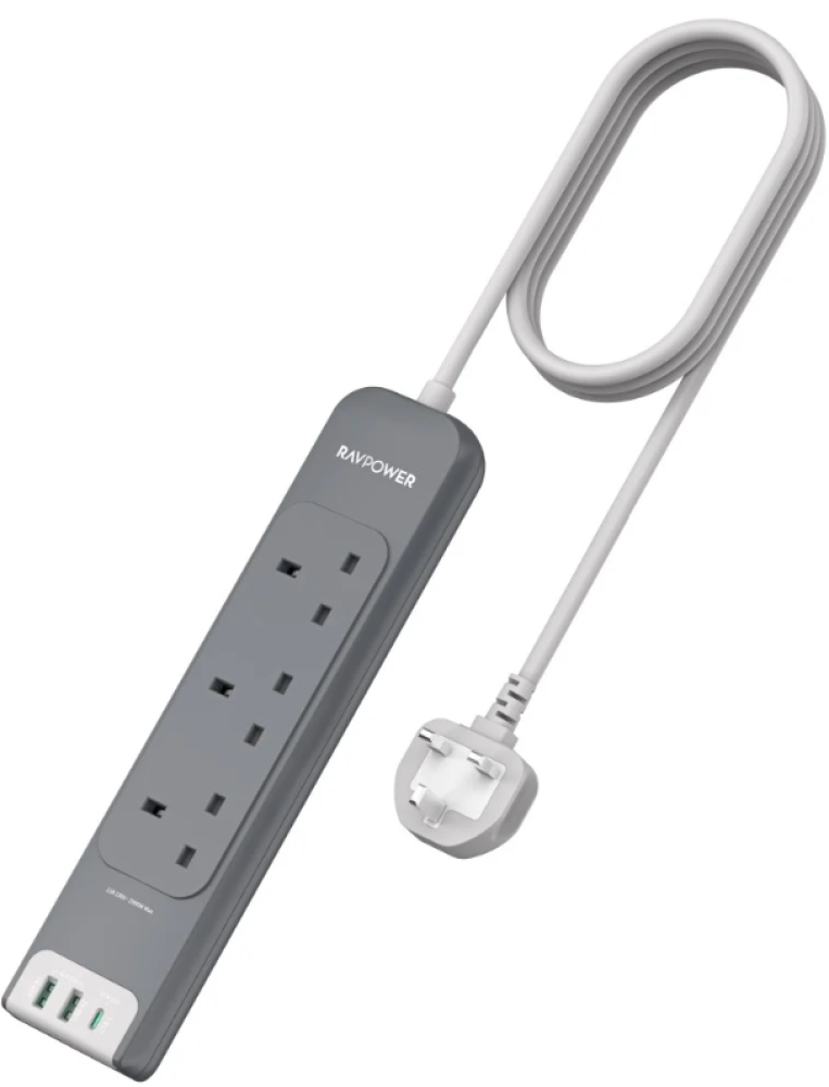 توصيلة راف باور 3 منافذ طاقة ومنفذين USB-A ومنفذ USB-C بطول 3 متر - رمادي